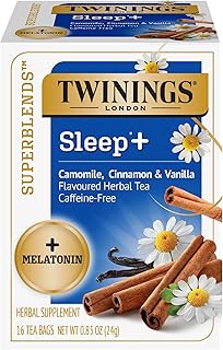 2. Twinings Superblends Sleep+ Herbal Tea with 1mg Melatonin Camomile, Cinnamon & Vanilla, Naturally Caffeine-Free, 16 Count (Pack of 1), Enjoy Hot or Iced, 16 Teabags (⭐️ 4.5)